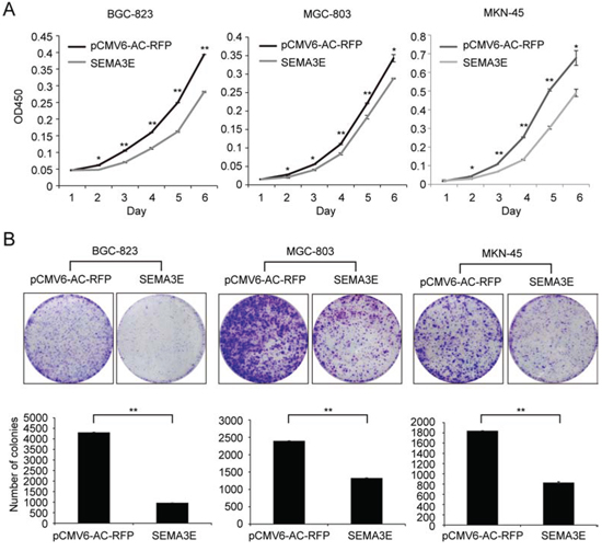Figure 4: Sema3E inhibited proliferation and colony formation of gastric cancer cells in vitro. A. Forced Sema3E expression attenuated the proliferation of the three cell lines. B. Ectopic Sema3E expression inhibited colony formation of the three gastric cancer cell lines. Representative colony formation pictures of cells transfected with SEMA3E and control vector are shown. The histograms represent the number of colonies, and the data are shown as the mean ± SD. The experiments were all repeated at least 3 times to confirm the reproducibility of the results. **P < 0.01, *P < 0.05 versus the control.
