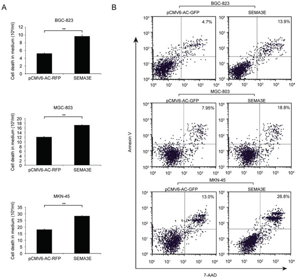 Figure 6: Sema3E promoted apoptosis of gastric cancer cell lines. A. Trypan blue staining was used to assess the number of dead cells in the cell culture supernatant of gastric cancer cell lines transfected with SEMA3E or with control vector. The histogram column indicates the number of dead cells, and the data are shown as the mean ± SD. Statistical analysis was conducted with paired t-test. B. The apoptosis of BGC-823, MGC-803 and MKN-45 cells transfected with SEMA3E or control vector was analyzed by Annexin V: PE Apoptosis Detection Kit. The percentage of cells in the late stage of apoptosis is shown. **P < 0.01 versus the control.
