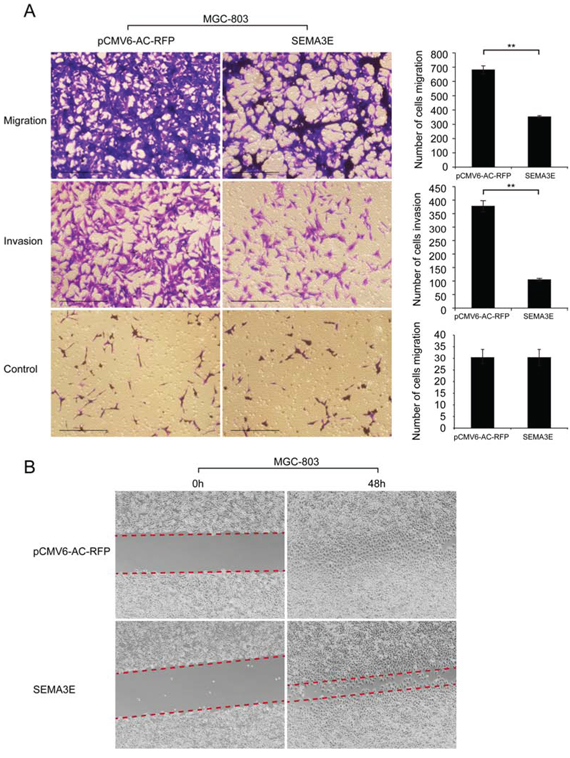 Figure 7: Sema3E modulated the migration and invasion of gastric cancer cell lines. A. The migration and invasion abilities of MGC-803 gastric cancer cell line after transfection with SEMA3E were evaluated by BD migration and matrigel invasion assays. All experiments were repeated at least three times. Representative fields of cells that invaded are shown. The histogram indicates the number of cells that invaded; the data are shown as the mean ± SD. Scale bar is 500 μm. B. Wound healing experiment was used to analyze the migration of MGC-803 cells transfected with SEMA3E. **P < 0.01 versus the control.
