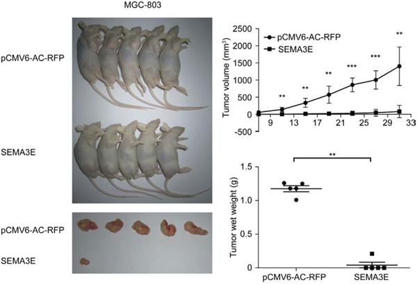 To investigate the effect of Sema3E on tumorigenicity in vivo, SEMA3E and control vector were transfected into MGC-803 gastric cancer cells. Transfection positive cells were then sorted by flow cytometry (BD FACSCANTO II, BD Biosciences, USA) according to RFP tag. Subsequently, these cells were inoculated into right armpit of nude mice. As expected, Sema3E reduced the occurrence of visible tumors from MGC-803 cells, and only 1 in 5 mice developed tumors from these cells. In contrast, the cells that were transfected with control vector produced tumors in all 5 mice. Sema3E significantly suppressed tumorigenicity of MGC-803 cells in vivo, and the size and weight of Sema3E-overexpressing tumors were clearly lower than those of xenografts formed from cells transfected with control vector (Fig. 8).