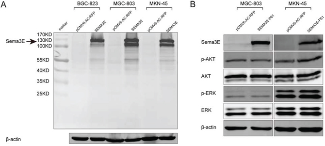 Figure 10: The full-length Sema3E protein exerted an inhibitory effect on gastric cancer cell lines. A. Immunoblotting was used to assess the isoforms of Sema3E in gastric cancer cells transfected with SEMA3E. B. The P61 form of Sema3E was unable to inhibit ERK1/2 and Akt phosphorylation in gastric cancer cells.