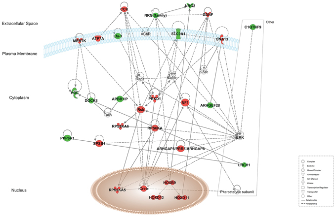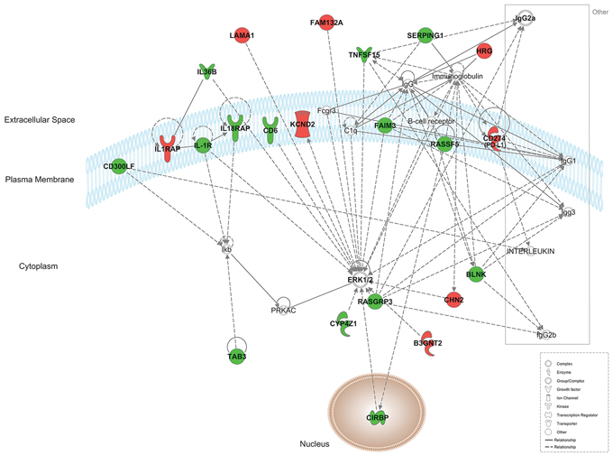 Figure 5: T cell receptor signaling canonical pathway obtained by IPA. Up- and down-regulated genes in red and green, respectively.