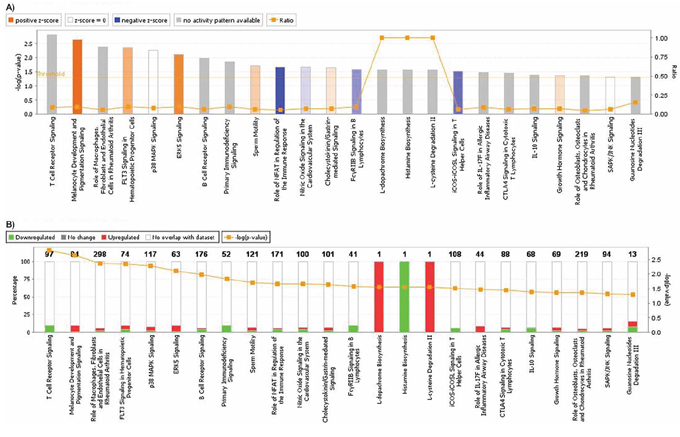 For analysis of Canonical Pathways a list of genes taken from the dataset obtained after data filtering is noted in the different canonical pathways used by IPA database. The results were analyzed using Fisher’s exact test to determine whether the number of genes included in the filtered data is greater than expected by chance in a given canonical pathway. The result of this analysis was evaluated by two measures: 1) ratio, that is the ratio between the number of genes of your dataset relative to the total number of genes in a given pathway; 2) p-value from Fisher’s exact test.