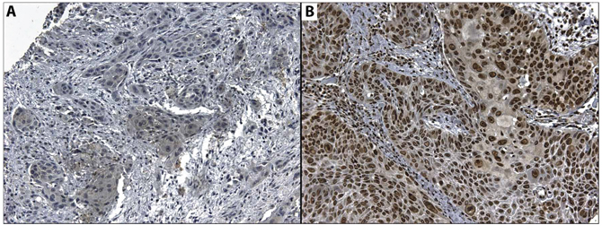 The slides were viewed under a microscope with image capture system (Leica DM4000B). For PD-L1, the cutoff chosen for membrane staining was 5% of tumor cells [35]. For cytoplasmic staining, we chose to use the same cut-off due to lack of studies using PD-L1 expression in cytoplasm. To HOXB9, we use a variation of the model proposed by Sha in gastric carcinomas [36]. The cases were dichotomized using a cut-off of 50% of tumor cells with nuclear staining.