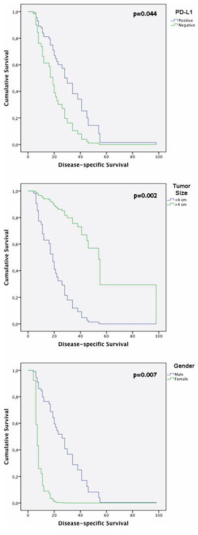 The follow-up period for the OSCC patients was used to determine survival rates and ranged from 4 to 108 months (mean, 20 months). The median survival time was 15.5 months. The 5-year disease specific survival rate was 40%. Cox’s Proportional Hazards multivariate analysis identified cytoplasmic PD-L1 [p = 0.044; HR: 0, 426 (C.I.: 0.186–0.977)], tumor size [p = 0.002; HR: 7.618 (C.I.: 2.139–27.128)] and gender [p = 0.007; HR: 0.112 [(C.I.: 0.022–0.554)] as independent prognostic markers shown in Table 3. Kaplan-Meier tables are presented in Figure 7.