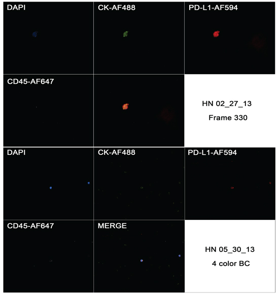 Figure 9: Captured images from a CTC in a HNSCC case (HN 02/27/13) showing positivity to CK, negativity for CD45 and strong and focal positivity to CD274 in first image (frame 330), and the same markers in a blood cell from a different case (HN 05/30/13).