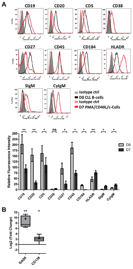 Figure 2: The immunophenotype of the generated ASCs. On D0, CLL B-cells were stimulated with PMA and CD40L, in combination with the cytokines IL-2, IL-10 and IL-15. On D4, cells were harvested and incubated with IL-2, IL-6, IL-10 and IL-15 for 3 days. A. On D0 and D7, cells were immunophenotyped by direct labeling of CD19, CD20, CD5, CD38, CD27, CD45, CD184, HLA-DR and surface (S)IgM. For cytoplasmic (Cy)IgM, cells were labeled after permeabilization with FITC-conjugated anti-human IgM mAbs or isotype-control mAbs. RFIs were calculated as the ratio of the MFI of cells labeled with a specific Ab to that of cells labeled with a matched isotype control. The Results are represented as mean RFI values ±SEM from eight experiments. Cytometry data are presented as plots for a representative patient. B. The expression of the CD138 and GAS6 genes was evaluated by quantitative real-time RT-PCR in CLL B-cells on D0 and D7 stimulated cells. Results are expressed relative to gene expression in CLL B-cells on D0, according to the 2-ΔΔCT method. The results are represented as the log2 fold change in box-and-whisker (min to max) plots (the “+” sign indicates the mean) from nine experiments. Statistical significance was calculated using Wilcoxon’s test: *p < 0.05, **p < 0.01, ns, not significant.