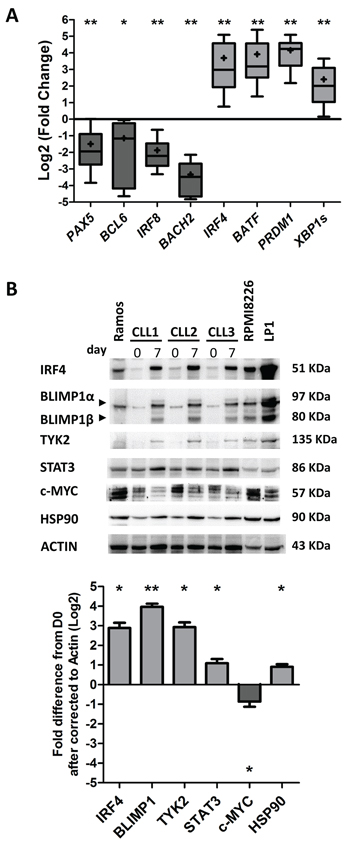 Figure 3: Transcriptional and proteomic analysis of transcription factors involved in plasma cell differentiation. A. The expression of the PAX5, BCL6, IRF8, BACH2, IRF4, BATF, PRDM1 and XBP1s genes was evaluated by quantitative real-time RT-PCR on D0 and D7. Results are expressed relative to gene expression in CLL B-cells on D0, according to the 2-ΔΔCT method. The results are represented as the log2 fold change in box-and-whisker (min to max) plots (the “+” sign indicates the mean) from 11 experiments. Statistical significance was calculated using Wilcoxon’s test: *p < 0.05, **p < 0.01, ns, not significant. B. Immunoblot analysis and densitometry quantification of IRF4, BLIMP1, TYK2, STAT3, c-MYC and HSP90 in cells from three CLL samples at D0 and D7. Ramos, RPMI8226 and LP1 cell lines were used as controls. Statistical significance was calculated using Student’s t-test: *p < 0.05, **p < 0.01.