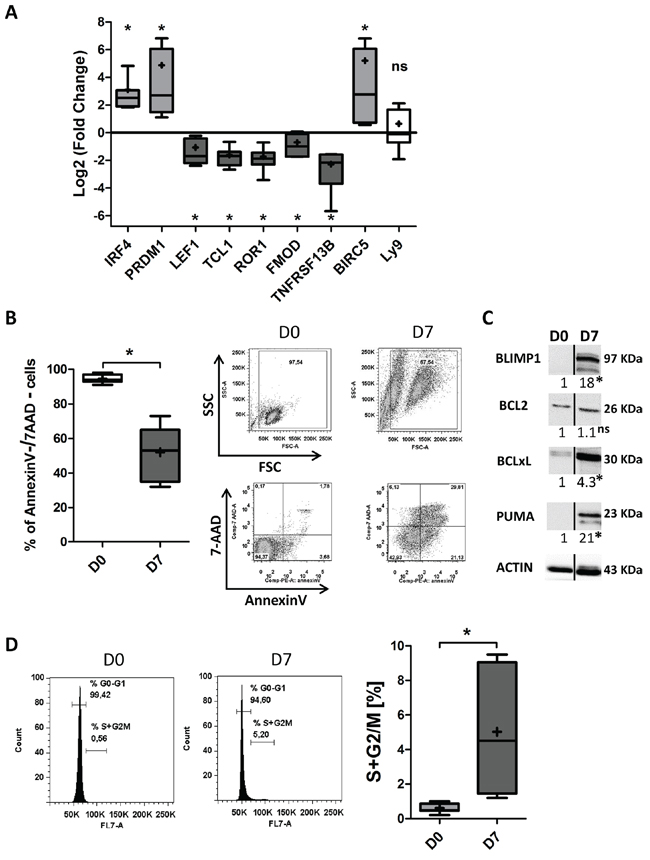 Figure 7: CpG/CD40L/c-derived CLL B-cells differentiation induces downregulation of the expression of CLL-pathogenesis-associated factors, decreased survival and a low proliferation rate. On D0, CLL B-cells were stimulated with CpG and CD40L, in combination with the cytokines IL-2, IL-10 and IL-15. On D4, cells were harvested and incubated with IL-2, IL-6, IL-10 and IL-15 for 3 days. A. The expression of the IRF4, PRDM1, LEF1, TCL1, ROR1, FMOD, TNFRSF13B, BIRC5 and Ly9 genes was evaluated by quantitative real-time RT-PCR on D0 and D7. Results are expressed relative to gene expression in CLL B-cells on D0, according to the 2−ΔΔCT method. The results are represented as log2 fold changes in box-and-whisker (min to max) plots (the “+” sign indicates the mean) for seven experiments. Statistical significance was calculated using the Wilcoxon’s test: *p < 0.05, ns, not significant. B. Cells were stained with Annexin V-PE and 7AAD at D0 and D7 to evaluate apoptosis. Left panel: the percentages of double-negative (i.e. annexin-V-negative and 7AAD-negative) living cells in seven experiments are represented in box-and-whisker (min to max) plots (the “+” sign indicates the mean). Right panel: cytometry plots from a representative patient. Statistical significance was calculated using the Wilcoxon’s test: *p < 0.05. C. Immunoblot analysis and densitometry values of BLIMP1, BCL2, BCLxL, and PUMA in cells at D0 and D7. The PUMA antibody also cross-reacts with an 18 kDa band of unknown origin. The black dividing lines on the blot data indicate that lanes are run on different parts of the same gel (non-adjacent lanes). The data shown are representative of three experiments. Statistical significance was calculated using Student’s t-test: *p < 0.05. D. At D0 and D7 of culture, the DNA content of living cells was measured by DyeCycle Violet staining. Results are represented as the summed percentages of cells in the S and G2/M phases of the cell cycle. Cytometry plots are representative of the results from five experiments. Day 7 values were compared with D0 values and statistical significance was calculated using Wilcoxon’s test: *p < 0.05.