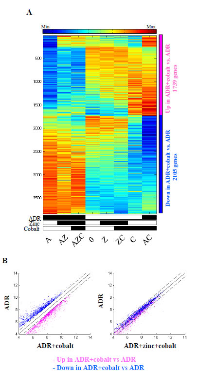 Figure 2: Expression of genes regulated by ADR+cobalt and reversed by zinc. (A) Heatmap of the genes that were differentially expressed (passed 5% FDR, and had at least 1.5 fold change) between ADR+cobalt treated cells (AC) and ADR treated cells (A). Data is centered and normalized after log2 and averaging of replicates, sorted using SPIN. The pink sidebar represents up-regulated genes and the blue sidebar represents down-regulated genes. (B) Left panel. Scatter plots of the genes that were up regulated (in pink) and down regulated (in blue) by ADR+cobalt (AC), compared with ADR treated cells (A). Dashed lines represent 1.5 fold changes (0.585 in log2 scale). Right panel. The same genes in the comparison of ADR+zinc+cobalt (AZC) to ADR treated cells (A), showing the counter effect of zinc on cobalt treated cells.
