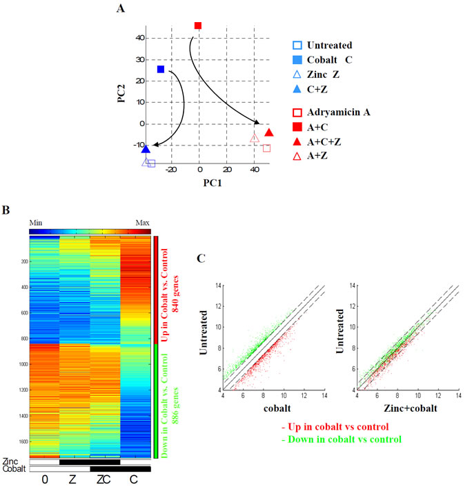 Figure 1: Expression of genes regulated by cobalt and reversed by zinc. (A). PCA of the samples, after log2 transformation and averaging between replicates, in the space of all probesets. Filled markers represent cobalt, red markers represent ADR and the triangular markers represent zinc. The arrows indicate the reverse effect of the zinc treatment when applied on cobalt, returning the expression to the original (untreated) position. (B) Heatmap of the genes that were differentially expressed (passed 5% FDR, and had at least 1.5 fold change) between cobalt treated cells (C) and untreated cells (0). Data is centered and normalized after log2 and averaging of replicates, sorted using SPIN [51]. The red sidebar represents up-regulated genes and the blue sidebar represents down-regulated genes. (C) Left panel. Scatter plots of the genes that were up regulated (in red) and down regulated (in green) by cobalt (C), compared with untreated cells (0). Dashed lines represent represent 1.5 fold change (0.585 in log2 scale). Right panel. The same genes when comparing zinc+cobalt (ZC) to untreated cells (0), showing the reversal of gene expression by supplemental zinc on cobalt treated cells.