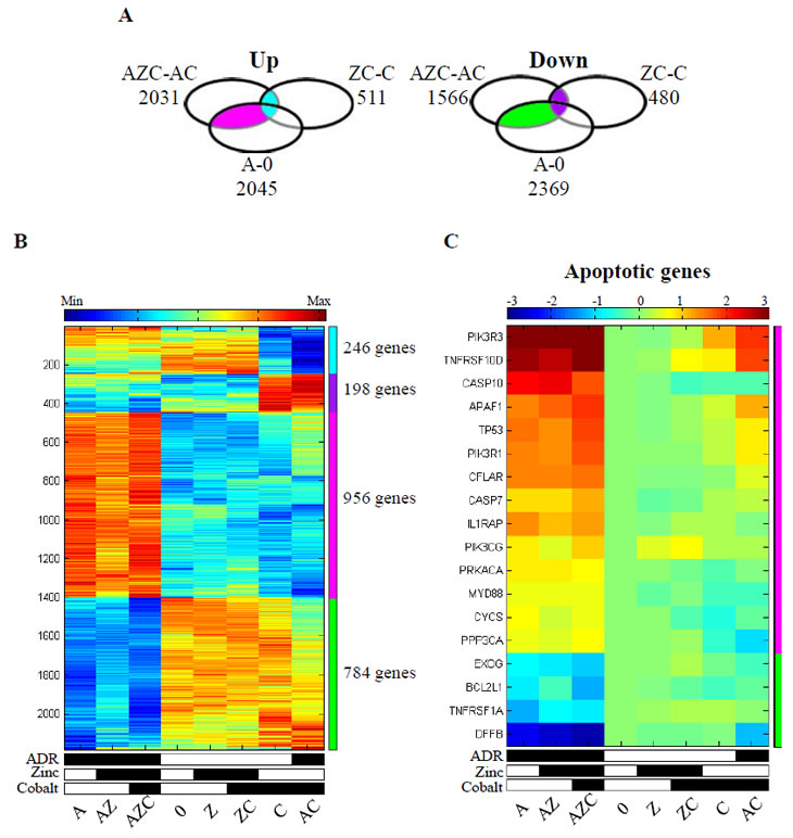 Figure 3: Zinc and adriamycin regulated genes in cobalt treated cells. (A). Venn diagram of the up- and down-regulated genes (passed 5% FDR, and had at least 1.5 fold change), following zinc supplement on cobalt treated (ZC) compared with cobalt treated cells (C), zinc supplement to ADR+cobalt treated cells (AZC) compared with ADR+cobalt treated cells (AC), and when comparing ADR treated cells (A) with untreated cells (0). The light blue and violet groups represent genes that are shared between AZC-AC and ZC-C (246 up- regulated and 198 down-regulated genes, respectively). The pink and green groups represent genes that are shared between AZC-AC and A-0, not including ZC-C (956 up-regulated and 784 down-regulated genes, respectively). The intersection of all three comparisons (i.e. AZC-AC and ZC-C and A-0) contains 28 up regulated and 31 down regulated genes. (B). Heatmap of the genes that belong to the colored groups (see Venn diagram, sidebar). Expression values are centered and normalized after log2 and averaging of replicates, sorted using SPIN. (C). Heatmap of apoptotic genes that were regulated by zinc addition to ADR+cobat treated cells. Expression values are presented as log2 fold change compared with the untreated cells. The differences between AZC column and AC column are at least 1.5 fold changes. The up-regulated genes belong to the pink group and the down-regulated genes belong to the green group.
