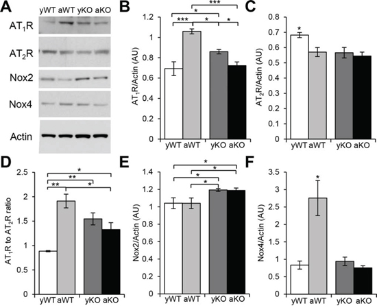 Figure 1: Expression of localized RAS receptors and downstream effectors in cardiac muscle. A. Western blot analyses of cardiac protein extracts from young WT (yWT), aged WT (aWT), young IL-10−/− (yKO) and aged IL-10−/− (aKO) mice using antibodies against angiotensin II type 1 (AT1R) and type 2 (AT2R) receptors and NAPDH oxidases (Nox) 2 and 4. Actin was used as a loading control. B. C. E. F. Relative expression was calculated for the Western blots displayed in (A.) in arbitrary units (AU). D. Ratio of the relative expression of AT1R (B.) to AT2R (C.). Data are means ± SEM. *p < 0.05; **p < 0.01; ***p > 0.001.