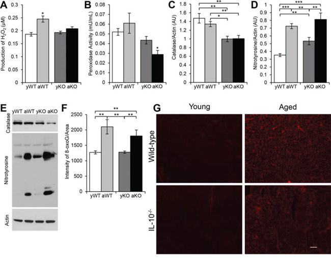 Figure 2: Measurements of reactive oxygen species, antioxidants and oxidative damage in cardiac muscle. A. Amount of H2O2 produced by mitochondria isolated from cardiac muscle of young WT (yWT), aged WT (aWT), young IL-10−/− (yKO) and aged IL-10−/− (aKO). B. Peroxidase activity measured in mitochondria isolated from cardiac muscles. C–D. Relative expression for the Western blot analyses of cardiac protein extracts E. using an antibody to catalase and nitrotyrosine in arbitrary units (AU). Actin was used as the loading control. F. Quantification of fluorescent intensity of 8-oxoguanine (8-oxoG) immunostaining G. of cardiac muscle cryosections. Scale bar: 100 μm. Data are means ± SEM. *p < 0.05; **p < 0.01; ***p < 0.001.