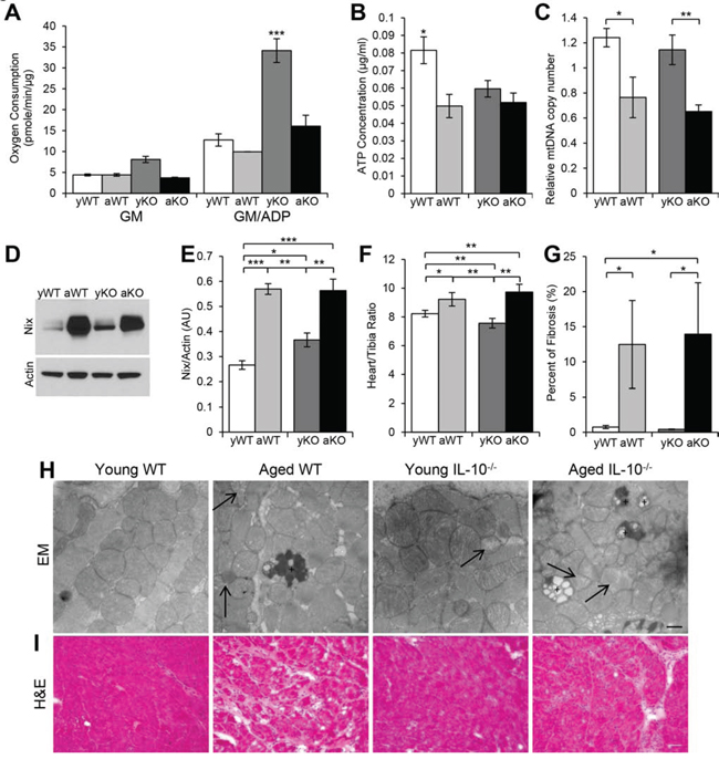 Figure 3: Altered mitochondrial parameters and cardiac remodeling. A. Oxygen consumption from mitochondria isolated from cardiac muscle of young WT (yWT), aged WT (aWT), young IL-10−/− (yKO) and aged IL-10−/− (aKO) after the addition of glutamate/malate (GM) in State 4 and GM and ADP in State 3 respiration. B. ATP concentration in cardiac muscle. C. Relative mitochondria DNA (mtDNA) copy number as a measure of the ratio between cytochrome B and GapDH. D. Western blot analyses using an antibody against Nix and E. the relative expression in arbitrary units (AU). Actin was used as a loading control. F. Cardiac hypertrophy measured as a ratio of heart weight to tibia length. G. Quantification of fibrosis evident in (I.). H. Representative EM pictures of mitochondria in cardiac muscle. Arrow shows depleted mitochondria. “+” is labeling lipofuscin granulas. Scale bar: 500 nm. I. Histological analyses of cardiac muscle cryosections using H&E. Scale bar: 100 μm. Data are means ± SEM. *p < 0.05; **p < 0.01; ***p < 0.001.