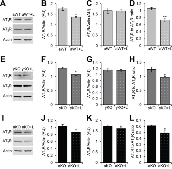 Figure 4: Losartan treatment modulated the cardiac renin-angiotensin system receptors. Western blot analyses of cardiac protein extracts from aged WT (aWT) A., young IL-10−/− (yKO) E., and aged IL-10−/− (aKO) I. mice with (+L) or without Losartan treatment using antibodies against angiotensin II type 1 (AT1R) and type 2 (AT2R) receptors. Actin was used as a loading control. Relative expression was calculated for the Western blots displayed in arbitrary units (AU) for aWT B–C., yKO F–G. and aKO J–K. Ratio of the relative expression of AT1R to AT2R for aWT D., yKO H. and aKO L.. Data are means ± SEM. *p < 0.05; **p < 0.01.
