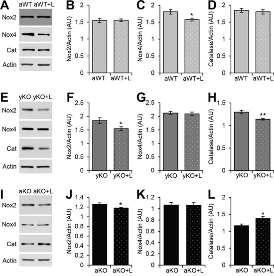 Figure 5: Effects of losartan treatment on downstream effectors of AT1R and antioxidants. Western blot analyses of cardiac protein extracts from aged WT (aWT) A., young IL-10−/− (yKO) E., and aged IL-10−/− (aKO) I. mice with (+L) or without losartan treatment using antibodies against NADPH oxidases (Nox) 2 and 4 and Catalase (Cat). Actin was used as a loading control. Relative expression was calculated for the Western blots displayed in arbitrary units (AU) for aWT B–D., yKO F–H. and aKO J–L. Data are means ± SEM. *p < 0.05, **p < 0.01.