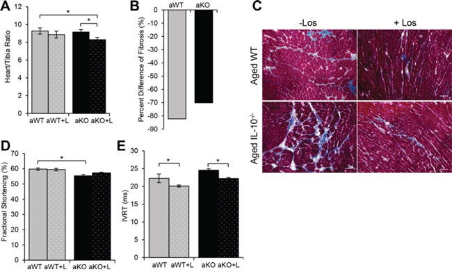 Figure 7: Effects of losartan treatment on cardiac remodeling and function. A. Cardiac hypertrophy measured as a ratio of heart weight to tibia length of aged WT (aWT) mice, aWT with (+L) losartan treatment, aged IL-10−/− (aKO) and aKO+L B. Quantification of fibrosis evident in Masson Trichrome stain C. Scale bar: 100 μm. D. Fractional shortening and E. isovolumetric relaxation time (IVRT) of aged WT and aged IL-10−/− with (+L) and without losartan treatment. Data are means ± SEM *p < 0.05.