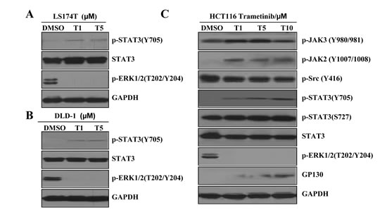 Figure 2: MEK inhibition induces STAT3 phosphorylation in K-Ras mutant colon cancer cells. (A) LS174T cells were treated with 1 and 5 µM trametinib (T) for 72 hr. P-STAT3 (Y705), STAT3 and P-ERK1/2 expression and activity levels were determined by western blotting. (B) DLD-1 cells were treated with 1 and 5 µM trametinib (T) for 72 hr. P-STAT3 (Y705), STAT3 and P-ERK1/2 expression and activity levels were determined by western blotting. (C) HCT116 cells were treated with 1, 5, 10 µM trametinib (T) for 24 hr. Proteins expression and activity levels were determined by western blotting. GAPDH served as the loading control.