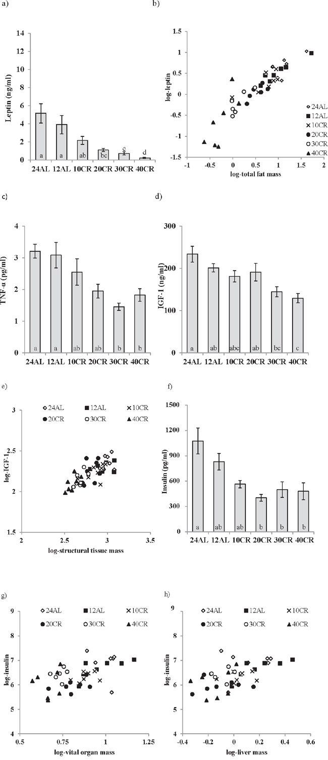 Figure 1: Hormonal changes measured in male C57BL/6 mice following calorie restriction (CR). Mice were fed 12 or 24 hrs ad libitum (12AL or 24AL) or calorie restricted (CR) by 10, 20, 30 or 40% (10CR, 20CR, 30CR and 40CR) for 3 months. Circulating levels of a. leptin, c. tumor necrosis factor (TNF)-α, d. insulin-like growth factor (IGF-1) and f. insulin. Significant hormonal relationships are shown between b. fat mass and leptin, e. structural tissues and IGF-1, g. vital organs and insulin and h. liver and insulin. Results are expressed as mean ± sem. Different letters denote significant differences between treatment groups.