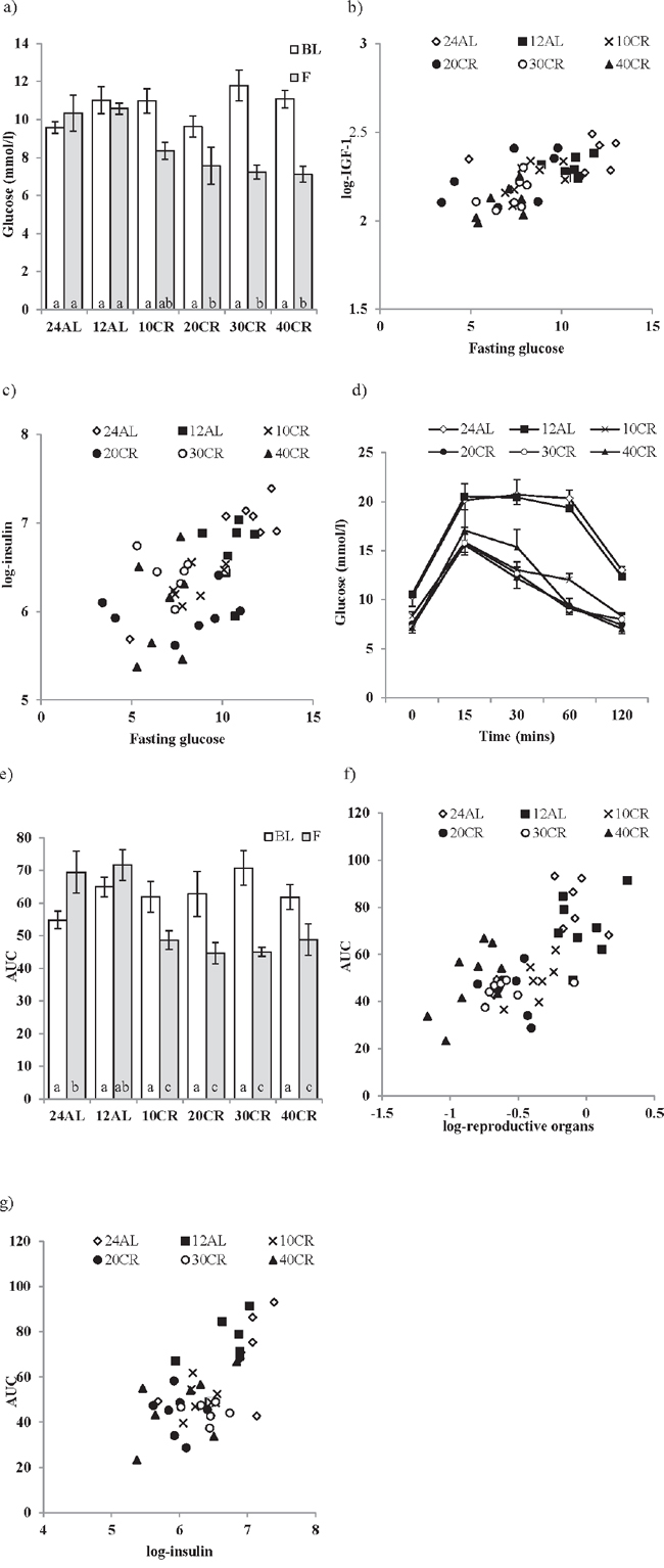 Figure 2: The effect of graded levels of calorie restriction (CR) on glucose homeostasis. a. Fasting glucose concentrations at baseline (BL) and following 3 months of CR (F). Strong relationships between fasting glucose and b. IGF-1 and c. insulin were found. d. Glucose concentrations measured over 120 minutes following glucose injection evaluated after 3 months of CR, e. glucose tolerance calculated as area under the curve (AUC). f. Relationship between reproductive organs and AUC and g. insulin and AUC. Mice were fed graded levels of calorie restriction (CR) (10CR, 20CR, 30CR and 40CR) and control groups were fed ad libitum (AL) for 12 or 24 hrs (12AL or 24AL). Different letters within a time point indicate significant differences between groups. Data represented as mean ± sem.