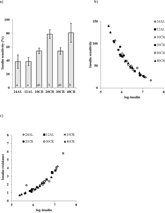 Figure 3: a. Improvements in insulin sensitivity following calorie restriction (CR). Insulin sensitivity was estimated from the homeostatic assessment model (HOMA2), following 3 months of graded calorie restriction (CR) (10CR, 20CR, 30CR and 40CR) or control fed 12 hr or 24 hr ad libitum (12AL and 24AL). Not surprisingly very strong relationships were found between insulin and b. insulin sensitivity and c. insulin resistance. Different letters indicate significant differences between groups. Results are expressed as mean ± sem.