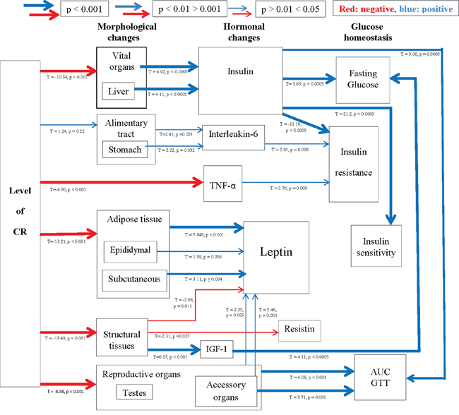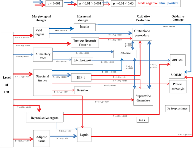 None of the four theories emerged as solely explaining the beneficial effects of CR. Instead, we identified a highly inter-related network of responses supporting three of the four theories: i) body fat reduction, ii) modulation of insulin sensitivity and the IIS pathway, and iii) reproductive investment trade-offs. CR influenced hormonal changes; in particular reductions in leptin and TNF-α. Both these hormones were reduced in a graded manner relative to the level of CR with leptin specifically linked to reductions in fat mass, structural tissues and reproductive organs. How the reduction in leptin might contribute to the aging process is not fully understood. We know that disruption of leptin signaling and leptin resistance plays a critical role in obesity, a major risk factor for morbidity and mortality, and obesity-related disease such as impaired glucose metabolism, cancer, and the development of cardiovascular disease. Improvements in insulin sensitivity and modulation of the IIS pathway and the subsequent increase in lifespan are much better understood with pathways conserved from worms to humans [142]. The hypothesis that CR decreases oxidative damage and increases antioxidant enzyme levels was not supported here. Differences between studies, duration, diet composition and severity of CR are all important factors which need to be taken into account, as well as tissues and assays used. Our results do however unequivocally show that, in the short-term, 3-month PR does not replicate the changes observed with CR and this may be attributed to the lack of change in body composition changes under PR.