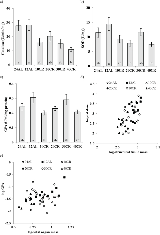 Figure 5: Changes in enzymatic antioxidant activity in the liver following calorie restriction (CR). a. catalase, b. superoxide dismutase (SOD), c. glutathione peroxidase (GPx) activity after 3 months of CR at varying levels. 10, 20, 30, 40% (10CR, 20CR, 30CR and 40CR) compared to 12 hr or 24 hr ad libitum feeding (12AL and 24AL). The relationships between d. structural tissues and catalase and e. vital organs and GPx are shown. Different letters signify differences between groups. Data represented as mean ± sem.
