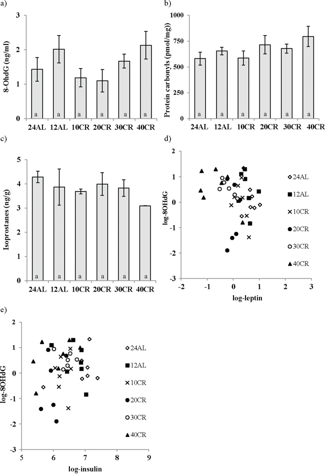 Figure 6: Calorie restriction (CR) did not impact changes in oxidative damage in the liver. DNA, protein and lipid damage are shown as a. 8-Hydroxy-2′-deoxyguanosine (8-OHdG), b. protein carbonyls, c. F2-isoprostanes respectively. While a negative relationship between d. leptin levels and 8-OHdG was found e. insulin was positively linked to 8-OHdG. Mice underwent 3 months of graded CR, 10, 20, 30, 40% (10CR, 20CR, 30CR and 40CR), and were compared to 12 hr or 24 hr ad libitum feeding (12AL and 24AL). No differences were found between groups. Data represented as mean ± sem.