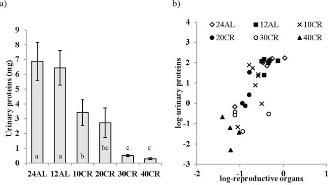 Figure 8: The level of major urinary proteins (MUPs) were lowered following calorie restriction (CR). MUPs measured as an indication of the level of investment in reproduction was a. influenced by graded CR and b. strongly related to changes in reproductive organs. Significant differences between groups are indicated by different letters. Data shown as mean ± sem.