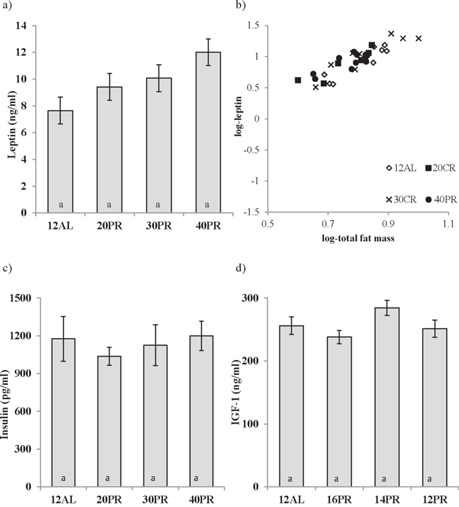 No relationship between the concentration of circulating leptin and the level of dietary protein was observed (One way ANOVA: F3,31 = 1.022, p > 0.05) (Figure 9a). However, leptin levels were strongly related to the body fat mass (Figure 9b). Circulating insulin (One way ANOVA: F3,31 = 0.272, p > 0.05) and IGF-1 (One way ANOVA: F3,31 = 2.39, p > 0.05) were also unchanged by PR and at a similar level to that recorded in the AL animals (Figure 9c and 9d). Please note the same scales are used for PR and equivalent CR graphs.