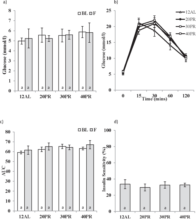 Figure 10: The effect of graded levels of protein restriction (PR) on glucose homeostasis. a. Fasting glucose concentrations at baseline (BL) and following 3 months of PR (F). 20PR, 30PR and 40PR represent 20%, 30% and 40% PR. Control groups were fed ad libitum (AL) for 12 hrs (12AL). b. Glucose concentrations following glucose injection measured after 3 months graded PR, c. glucose tolerance calculated as area under the curve (AUC) and d. insulin sensitivity estimated from the homeostatic assessment model (HOMA2). Different letters within a time point indicate significant differences between groups. Data represented as mean ± sem. Results are shown on the same axis as Figure 2.