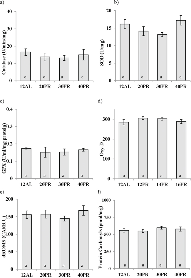 None of the 3 enzymatic antioxidants measured in the liver were influenced by PR (One way ANOVA, catalase: F3,19 = 0.438, p > 0.05, SOD: F3,19 = 2.382, p > 0.05, and GPx: GPx F3,19 = 0.370, p > 0.05) (Figure 11a, 11b and 11c). Similarly no changes in the circulating levels antioxidant capacity (One way ANOVA: F3,30 = 1.846, p > 0.05) were recorded (Figure 11d). No impact of PR was noted in the production of d-ROMs (One way ANOVA: F3,31 = 0.370, p > 0.05) (Figure 11e). No indication of protein damage due to the dietary treatment, as assessed by measurement of protein carbonyls, was observed (F3,19 = 0.660, p > 0.05) (Figure 11f).