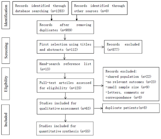 The study selection procedure is presented in Figure 1. In the initial literature search, 1283 studies were relevant to the search terms. Of which, we excluded 294 studies because of overlapping data sets. Then, 877 studies were ruled out because of apparent irrelevance when reading the title and/or abstract. An additional 13 relevant studies were included from reference lists. By reading through the full texts of the remaining studies, 62 studies were excluded (22 studies shared an identical population, 23 studies had no relevant outcomes, nine studies were with small sample size, and eight articles were letters, comments or correspondence). Moreover, 8 studies were ruled out due to the duplicate patients. Finally, 55 articles were left with sufficient data for extraction.