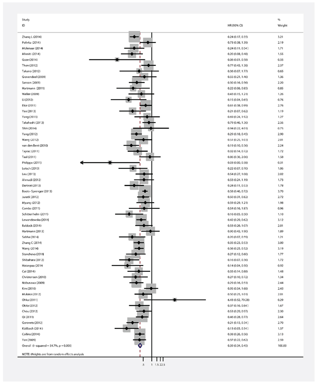 IDH mutations may serve as prognostic factors and are strongly correlated with good prognosis in patients with glioma. Many studies have shown that the median OS of patients whose glioblastoma harbor an IDH1 and IDH2 mutations was significantly longer than that of patients whose glioblastoma harbor wild-type IDH [30, 54, 73]. In addition, IDH mutations are associated with better prognosis in patients with anaplastic astrocytoma [57]. Subsequent multivariate analysis confirmed that IDH1 mutation may be an independent favorable prognostic marker in glioblastoma and anaplastic glioma after adjustment for other genomic profiles and treatment modalities [74]. The present meta-analysis further confirms the prognostic value of IDH mutations based on different clinical and pathological featuresreported in 55 observational studies (9487 patients).