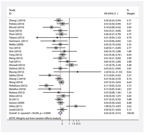 The Stata 12.0 statistical software (Stata Corporation, College Station, TX, USA) was used to perform the meta-analysis. Hazard ratio (HR) and 95%CI were obtained directly from each article or from an estimation of the Kaplan-Meier survival curves using the methods by Parmar et al [16]. An HR < 1 indicated a better prognosis in patients with glioma and IDH mutation, whereas an HR > 1 implied a poor prognosis. If several HR estimates were presented in the same study, we chose the most powerful one (multivariate analysis was superior to univariate analysis, and univariate analysis was superior to unadjusted Kaplan-Meier analysis).