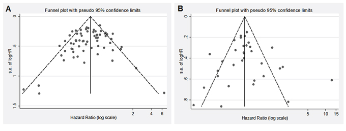The present meta-analysis may have several limitations that need to be addressed. First, in spite of the comprehensive search strategy, we cannot avoid the possibility of having missed relevant studies, in particular studies published in languages other than English. There may have been negative studies that were never published as full-length articles, and the original data of several studies could not be obtained. Secondly, we based our analyses on retrospective studies rather than prospective studies, so that it is hard to effectively avoid recall and selection biases. Thirdly, several of the HRs in the included studies were from rough estimates of Kaplan-Meier survival curves, so the results may be not so accurate. Fourthly, most of the HRs were from multivariate analyses by adjusting for confounding factors; however, there were different confounding factors in different included studies. Therefore, the merged HRs have a degree of heterogeneity. Fourthly, the proportion of histological subtypes varies between studies, suggesting a potential diagnostic bias between centers. Finally, evident heterogeneity existed for several outcomes that could not be explained substantially by our present subgroups. This limits our understanding of the association in various settings and restricts the general is ability of our findings.