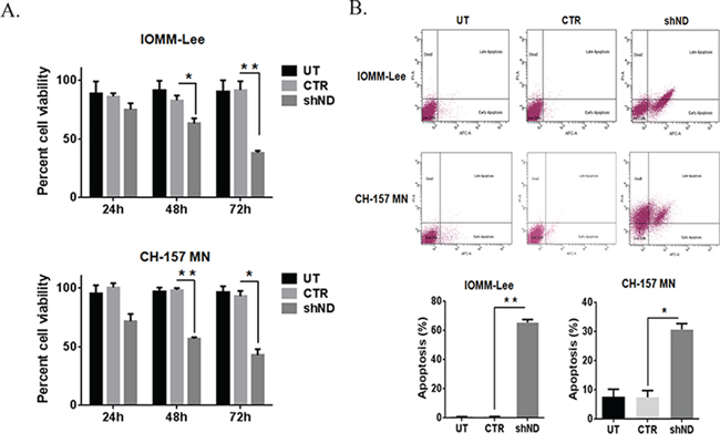 Figure 1: Knockdown of NDRG4 decreases the cell viability and induces the apoptosis. A. IOMM-Lee and CH-157 MN cells were infected with viruses generated in HEK 293T cells transfected with Control vector (CTR) or NDRG4 (shND) specific shRNA. Equal numbers of IOMM-Lee and CH-157 MN cells were plated in 96-well plates after gene silencing. After 24 hrs, 48 hrs and 72 hrs, cells were treated with MTT and the cell viability was determined using a colorimetric cell proliferation assay. Shown is the percent viability. Error bars indicate SEM (*p < 0.05, n = 3). B. Suppression of NDRG4 gene expression induces apoptosis in IOMM-Lee and CH-157 MN cells. IOMM-Lee and CH-157 MN cells were infected with lentivirus generated in HEK 293T cells transfected with Control vector or NDRG4 specific shRNA. 72 hrs of post transduction, untreated (UT), control (CTR) and shNDRG4 (shND) treated cells were stained with Annexin V-APC/propidium iodide and analyzed by flow cytometry. The graph indicating the percent apoptosis for each treatment group is shown SEM of triplicates. *p < 0.05.