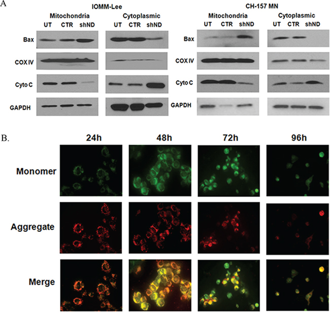 Figure 3: A. Subcellular distribution of BAX and cytochrome c. IOMM lee and CH-157 MN cells were infected with lentivirus generated in HEK293T cells transfected with control vector or NDRG4 specific shRNA. 72 hrs of post transduction, untreated, control and shNDRG4 treated cytosolic (40 μg) and mitochondrial (40 μg) protein fractions were immunoblotted-using antibodies to cytochrome c and BAX. GAPDH and COX IV were used to determine loading in cytosolic and mitochondrial fraction respectively. B. Mitochondrial membrane potential damage (ΔΨm). Mitochondrial membrane potential damage was evaluated using JC-1 reagent. To determine the initiation of mitochondrial apoptosis IOMM-Lee cells were infected with lentivirus generated in HEK 293T cells transfected with control vector or NDRG4 specific shRNA. After 24 hrs, 48 hrs 72 hrs and 96 hrs of post transduction, untreated, control and shNDRG4 treated cells were collected and stained with JC-1 fluorescence dye and images were captured with confocal microscopy. We carried out Immunofluorescence analysis of mitochondrial membrane potential by JC-1 staining for decreased red fluorescence (JC-1 aggregates) and increased green fluorescence (JC-1 monomers).