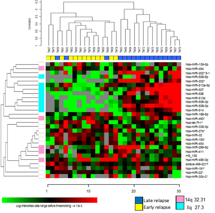 The association of chrXq27.3 miRNA cluster lower expression with shorter TTR, suggested a possible involvement of these miRNAs in cell growth and response to therapy.