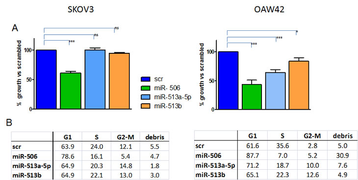 Figure 5: Effects of forced expression of chrXq27.3-cluster selected miRNAs on EOC cell line survival and cell cycle. A) Percentage of cell viability evaluated by trypan blue exclusion assay 72 h after miR-506, miR-513a-5p or miR-513b transfection on SKOV3 and OAW42 cells compared to control-transfected cells (scr). Data are the mean ± SD of three experiments. *** : P < 0.005; ** P < 0.01. B) Effects on cell cycle dynamics on the same cells as assessed by cytofluorimetric analysis. A representative experiment of three performed is shown.