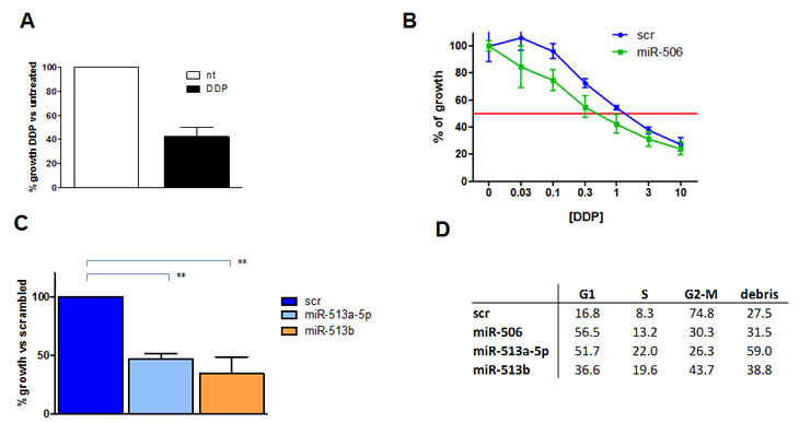 Based on these data, OAW42 cell line was selected to assess the effect of the forced expression of the three miRNAs on response to DDP treatment. A growth inhibition of 58±8% (Figure 6A) was observed in scrambled miR-transfected (control) cells exposed to a DDP concentration that, according to our previous knowledge, corresponds to IC50 in parental cells. DDP sensitivity at concentration ranging from 10x10-6 to 0.03x10-6 M was significantly increased (P=0.001) as assessed by sulphorodamine-B (SRB) assay following forced expression of miR-506 (Figure 6B). Also miR-513a-5p and miR-513b caused a significantly increased DDP sensitivity. At a DDP concentration corresponding to the IC50 in scramble-transfected cells, cell growth was further inhibited following 54±5% following miR-513a-5p and 66±14% by miR-513b transfection (Figure 6C).