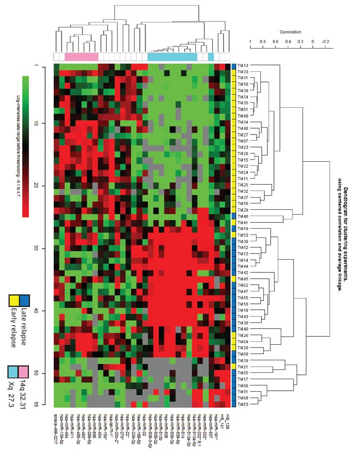 Class comparison, hierarchical clustering, muldimensional scaling (MDS), global test of clustering, and heat map analyses were performed using BrB ArrayTools_v4.1.0-stable release (Simon, R. and Lam, AP; http://linus.nci.nih.gov/BRB-ArrayTools.html). Principal component analysis (PCA) was performed using the open-source PCA module of MeV (MultiExperiment Viewer, v4.6; http://mev.tm4.org), developed at The Institute for Genomic Research. The clinical and pathological characteristics of the three sets of patients were compared by Fisher’s exact test. Levels of miRNA and gene expression were compared by a Student’s t test. The linear relationship between variables was estimated by Pearson’s coefficient of correlation (r) and R2 coefficient of determination. We assessed the association of miRNA expression with TTR.