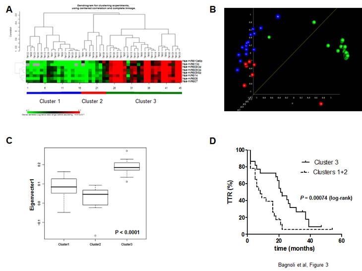 Figure 3: Down-regulation of chrXq27.3 miRNAs associated with shorter TTR. A) Unsupervised clustering of validation set samples, according to chrXq27.3 miRNA expression by qRT-PCR. B) Multidimensional Scaling (MDS) analysis. MDS analysis preserves the pair-wise similarities between samples in a three-dimensional graphical representation without forcing the samples into specific clusters as done by hierarchical clustering. The P-value of global clustering test based on three components (covering 92% of total variation) obtained by Euclidean distance is <0.001. MDS was generated using uncentered correlation. C) Principal component analysis. The box plot shows the eigenvalues for the 3 clusters based on the first principal component accounting for 44.1% of the overall variability of the miRNA data across the 45 samples. Kruskal-Wallis test: P-value< 0.0001. D) Kaplan-Meier survival curves of patients included in the validation set stratified according to chrXq27.3 cluster classification, clusters 1 and 2 (dotted line) and cluster 3 (continuous line). Curves were compared using the log-rank test; P = 0.00074.