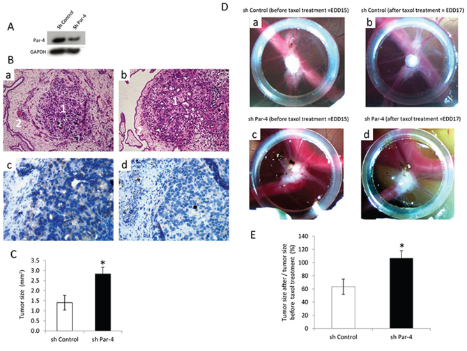 Figure 5: Influence of PAR-4 on the efficiency of taxol on tumour development. A. Western blot analysis of PAR-4 levels after transfection of SKOV-3 cells with shControl or shPAR-4. B. HE staining of shControl tumour (a) and shPAR-4 tumour (b) tissues. The magnification used is ×200. Numbers 1 indicate tumours and numbers 2 show the chicken membrane. PAR-4 staining of shControl tumour (c) and shPAR-4 (d) tissues. The brown colour represents the PAR-4 expression. The magnification used is ×400. C. Evaluation of the tumour size before taxol treatment on EDD 15 (n = 10 for shControl and n = 14 for shPAR-4) using ImageJ software. D. On EDD8, shControl SKOV-3 cells (a) or shPAR-4 SKOV-3 cells (c) suspension are placed into the silicon O-ring for 4 days to allow tumour growth. On EDD15, shControl (a) or shPAR-4 tumours (c) are treated topically with 25 μl of 25 μM of taxol for 2 days. On EDD17, tumour size of shControl (b) and shPAR-4 (d) is monitored using a Wild Heerbrugg M3Z microscope at 10× magnification with a Lumenera INFINITY2–1 CDD camera with Infinity Capture Software. E. Evaluation of the tumour size after taxol treatment (n = 10 for shControl and n = 14 for shPAR-4) using ImageJ software. The size of tumours on EDD 17 is measured and the average is done.