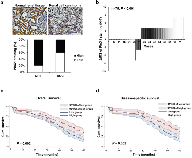 Figure 1: Expression of PinX1 is decreased in ccRCC tissues and associated with 5-year overall and disease-specific survival in ccRCC patients. a. top panel, representative photographs taken at 400 magnification showed PinX1 immunohistochemical staining in normal renal tissue and clear cell renal cell carcinoma. Bottom panel, PinX1 expression staining was lower in ccRCC tissues than in normal renal tissues. Immunohistochemical staining data was available from 35 normal renal tissues and 278 ccRCC tissues. b. The distribution of the difference in PinX1 staining (ΔIRS = IRSN–IRST). Immunoreactivity score (IRS) of PinX1 staining was available from 75 pairs of tissues; P values were calculated with the Wilcoxon test. PinX1 expression was lower in tumor tissues (T) compared with paired adjacent non-tumor tissues (N). c. Low PinX1 expression correlated with a poorer 5-year overall cumulative survival for 243 ccRCC patients (P = 0.002, log-rank test). d. Low PinX1 expression correlated with a poorer 5-year disease-specific cumulative survival for 216 ccRCC patients (P = 0.002, log-rank test). Cum. indicates cumulative.