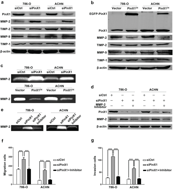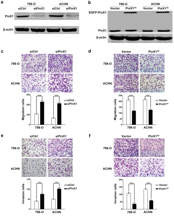 Because low PinX1 expression is associated with poor prognosis, supporting PinX1 may play important roles in one or more steps of tumor metastasis. Due to migration and invasion ability is crucial for tumor metastasis [28], we examined the effects of PinX1 on migration and invasion of ccRCC cells. We transiently transfected 786-O and ACHN cells with pEGFP-C3-control and pEGFP-C3-PinX1 plasmids or control siRNA and PinX1 siRNA, respectively. Twenty-four hours or forty-eight hours after transfection, PinX1 proteins were significantly overexpressed or knockdown in ccRCC cancer cells, respectively (Figure 2a and 2b). In the migration assay, we found that PinX1 knockdown in ccRCC cells significantly enhanced the ability to migrating through transwell filter inserts respectively (Figure 2c). Inversely, PinX1 overexpression dramatically suppressed the migration ability of ccRCC cells (Figure 2d). In cell invasion assay, we got the similar conclusion: PinX1 knockdown or overexpression can enhance or suppress the invasion ability of ccRCC cells (Figure 2e and 2f). However, overexpression or silence of PinX1 had no effect on the proliferation of ccRCC cells (Supplementary Figure S1a – S1d).