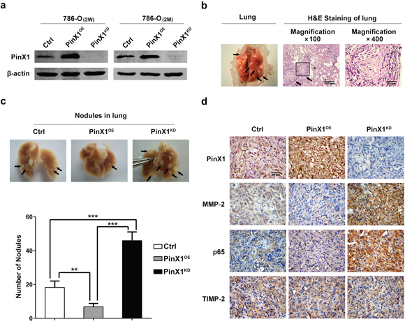 Figure 5: PinX1 suppress ccRCC metastasis in vivo. a. left panel, Western blotting of PinX1 from PinX1OE-786-O cell lines, PinX1KD-786-O cell lines and Ctrl-786-O cell lines selected with puromycin for 3 weeks after lentivirus infection. Right panel, PinX1 expression levels were not changed in PinX1OE, PinX1KD and Ctrl 786-O cell lines without puromycin selection for 2 months. b. Representative image of lung with metastatic nodules (left panel) and H&E staining sections of lung (right panel) 2 months after injection of PinX1KD 786-O cell lines in BALB/c nude mouse through tail vein. Arrows indicate metastatic nodules. c. top panel, Representative images of 10% buffered formalin fixed lungs with metastatic nodules 2 months after respective injection of Ctrl, PinX1OE and PinX1KD 786-O cell lines. Arrows indicate metastatic nodules. Bottom panel, the number of lung metastatic nodules was counted under a dissecting microscope. A statistically dramatic increase in the number of the lung metastases was seen in PinX1KD group, compared with the PinX1OE group and these two groups also had significant diversity compared with Ctrl group respectively. Data are displayed with means ± SD from 12 mice in each group. **, P < 0.01; ***, P < 0.001. d. Immunostaining of PinX1, MMP-2, p65 and TIMP-2 in metastatic nodules of PinX1OE, PinX1KD and Ctrl 786-O groups. MMP-2 and p65 expression in PinX1OE group were much lower compared with PinX1KD group and Ctrl group but TIMP-2 expression was not change in every group.