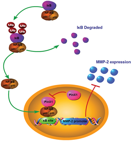 Figure 6: A hypothetic model of PinX1 suppresses MMP-2 expression via NF-κB signaling pathway. We presume that PinX1 can inhibit the expression of MMP-2 owing to the suppression of transcriptional activity of NF-κB proteins by direct protein-protein interaction with its G-patch domain.