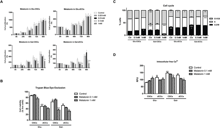 The effect of melatonin on cell cycle progression was dependent on the metabolic and differentiation status of the cells. In this regard, 1 mM melatonin 72 hours treatment induced an arrest at G2/M and G1/G0 phases respectively for the resistant Glu-CSCs and Glu-dCCs groups (p < 0.05). On the other hand, 1 mM melatonin induced an arrest at S-phase in both P19 cell groups cultured in galactose (glucose-free), glutamine/pyruvate-containing medium (p < 0.001) at expenses of reducing the number of cells on G2/M phase for Gal-CSCs, and on G1/G0 phase for Gal-dCCs (Figure 1C).